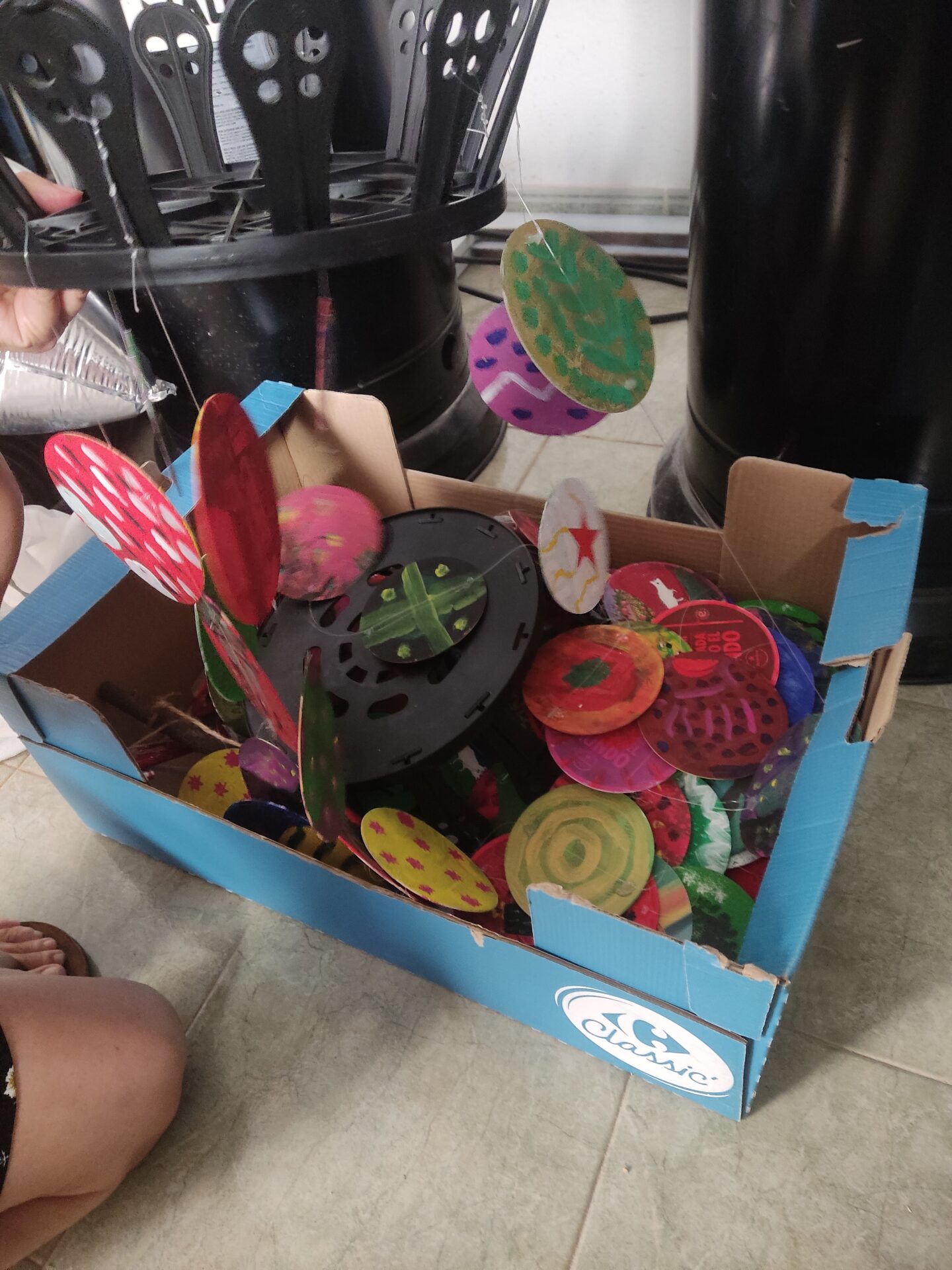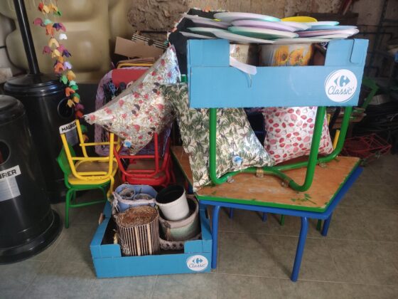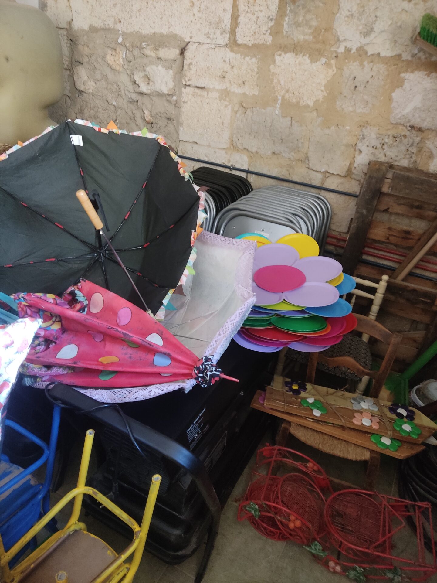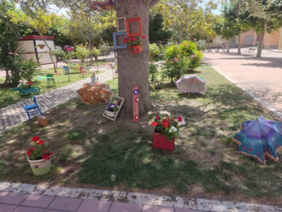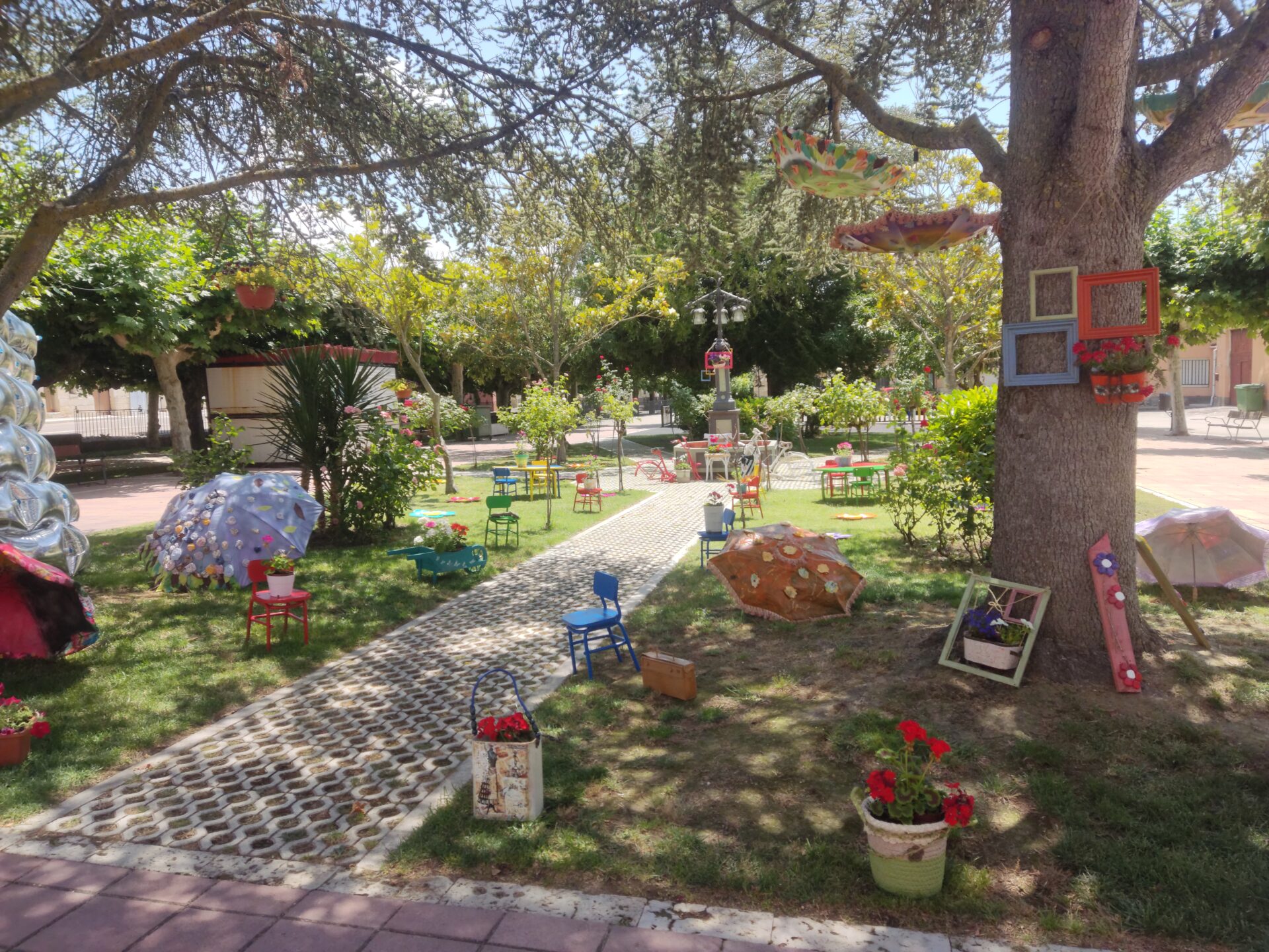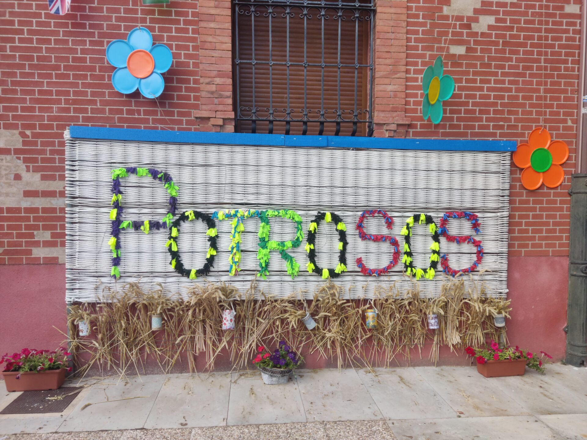 Es después de todo este esfuerzo por parte de los vecinos que llegamos, ahora sí, al comienzo del programa del festival Potrosos. La mayoría de las manualidades están realizadas con material reciclado. Platos de colores que hacen flores, paraguas decorados cuelgan de los arboles, los posavasos del teleclub se han repintado y ahora son móviles que tambien adornan los árboles, las bolsas que se encuentran en el interior de las cajas de agua, infladas como globos, componen un iglú plateado, diversos muebles ahora acogen macetas de flores… Las decoraciones se distribuyen armoniosamente por la plaza y, junto con los dos grandes carteles con los textos VILLAMEDIANA y POTROSOS, llenan la plaza de color.