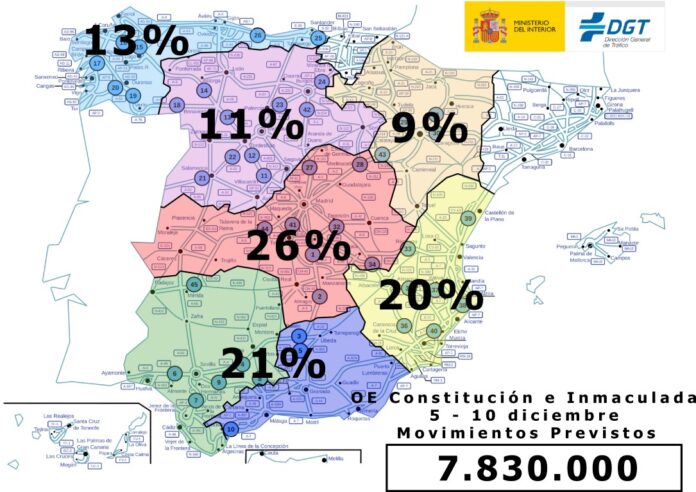 Al celebrarse las festividades en miércoles y viernes, esto hará que la salida de los grandes núcleos urbanos tenga lugar en dos fases: la primera y más significativa el martes 5 (entre las 17 y las 22 horas) y el miércoles 6 (de 10 a 14 horas), por el inicio del periodo del puente y, la segunda, el jueves 7 (entre las 18 y las 22 horas) y el viernes 8 (de 9 a 14 horas), por el comienzo del día festivo y del fin de semana. Por su parte, el retorno estará centrado principalmente en el domingo 10, principalmente entre las 16 y las 23 horas.
