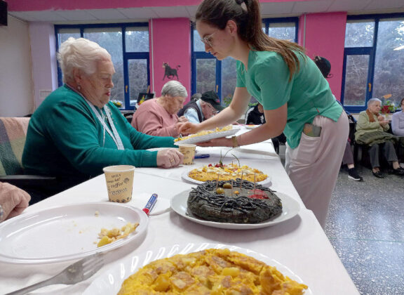 Entre tarea y tarea un chascarillo, una sonrisa, un recuerdo que nos lleva a la cocina del pueblo, a las celebraciones en familia alrededor de una mesa y con una buena tortilla e, incluso, cómo no, a las muchas excursiones realizadas con “Nuestros Mayores Viajeros”, donde este plato tan autóctono nunca falta. Incluso ha habido tiempo para compartir algún que otro consejo: echarle un poco de ajo para darle más sabor o un chorrito de leche para que quede más esponjosa.