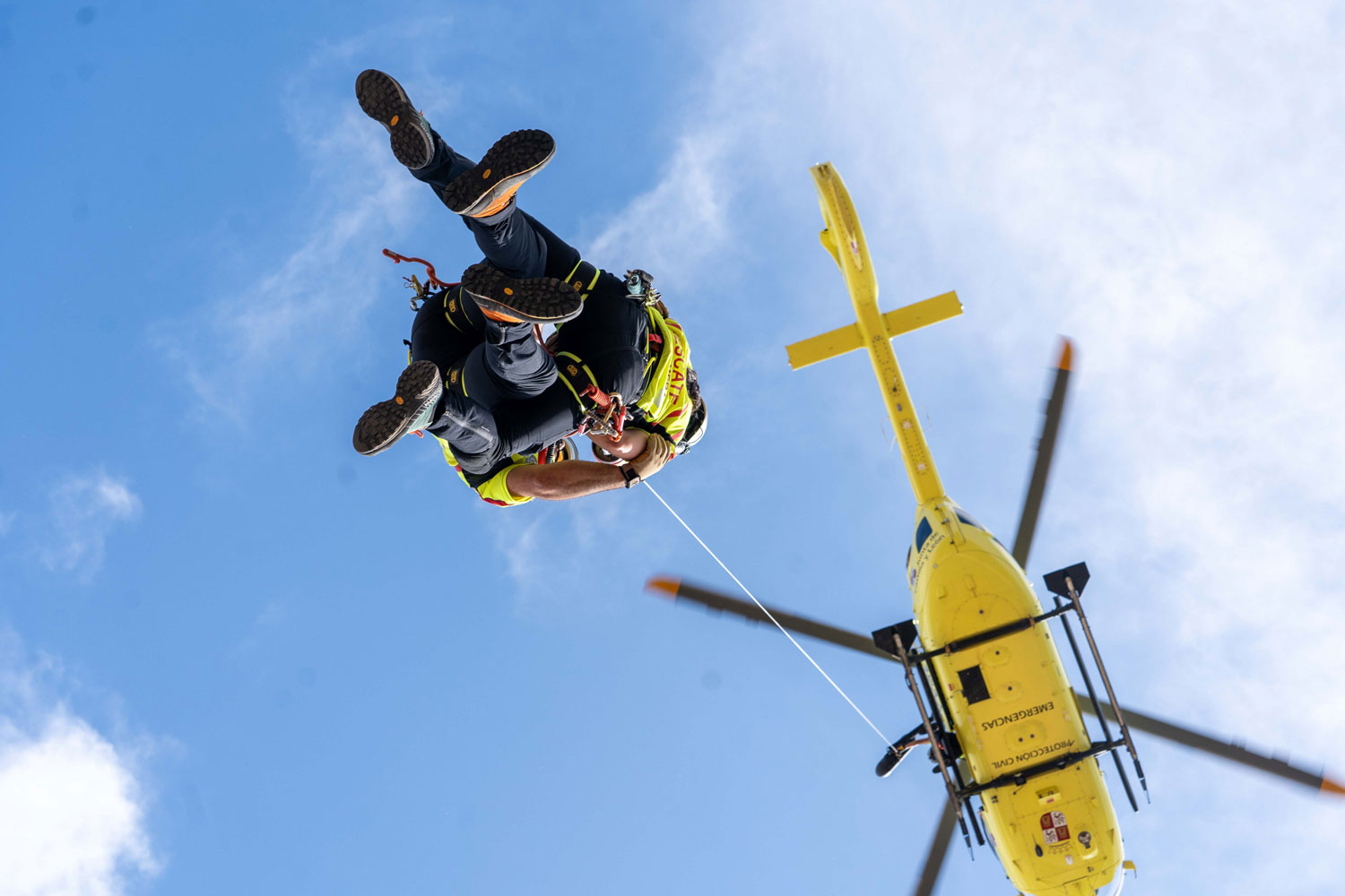La inmovilización y la movilización correcta y segura es esencial, de ahí que se cuente con un colchón de vacío, un ferno y camillas que cumplen la función de tablero espinal, un material que se une a una gran variedad de equipo de un nivel de soporte vital avanzado (pequeño respirador, oxígeno, DESA o material para intubar). Aun así, todo depende de cada rescate y las circunstancias de cada caso, por lo que hay que aplicar “mucha gestión y coordinación”, comenta. Ante la “mínima sospecha de dolor en el cuello o espalda se procede a la inmovilización de la persona”.