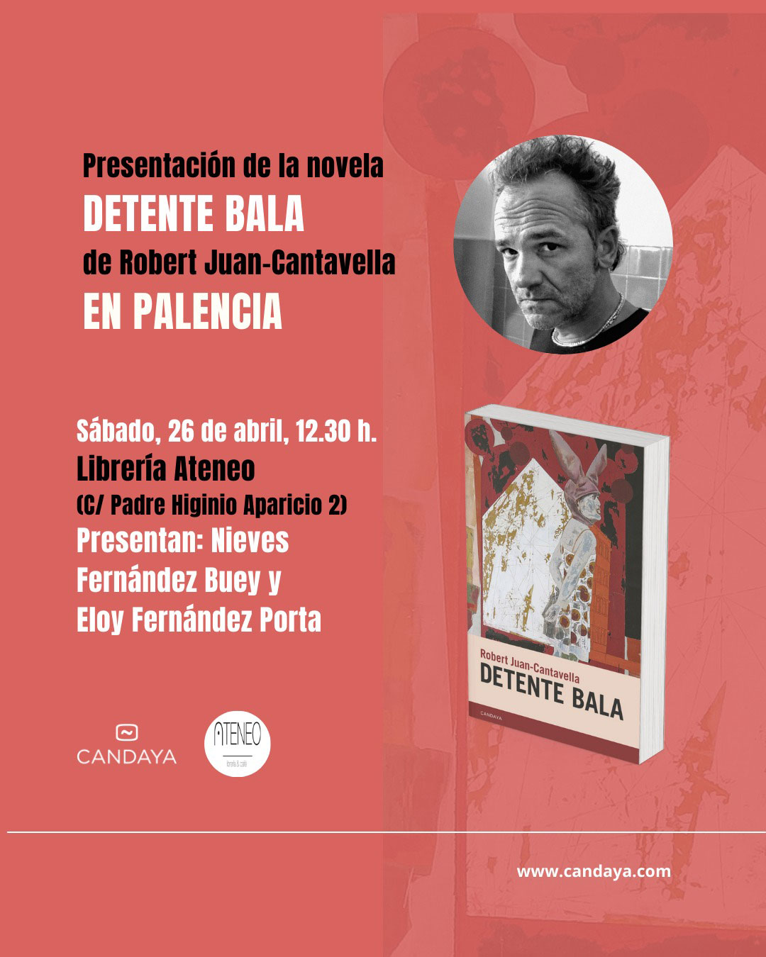 El escritor Robert Juan-Cantavella regresa con Detente bala, una obra que fusiona la locura, el plagio y la distorsión de la realidad en un arriesgado ejercicio literario. La presentación tendrá lugar el sábado 26 de abril a las 19:00 h en la Librería Ateneo (C/ Padre Higinio Aparicio 2), en Palencia. Los escritores Nieves Fernández Buey y Eloy Fernández Porta serán los encargados de introducir al autor y su fascinante novela.