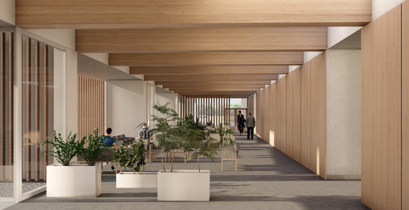 Otro de los aspectos que se han tenido en cuenta en las condiciones de diseño, es la protección pasiva frente al sol. El amplio recibidor acristalado se protege de la radiación directa mediante un amplio alero que enmarca y señala el acceso. De forma complementaria, se propone la inclusión de una celosía para proteger de las vistas y tamizar la entrada directa de luz en las zonas de espera.