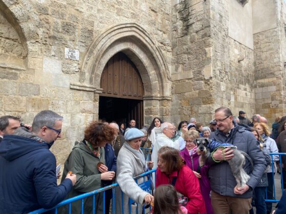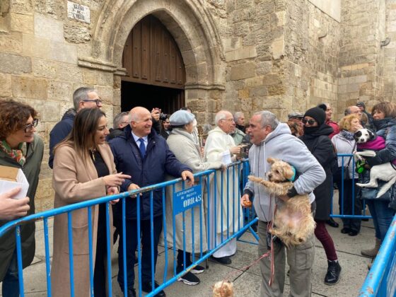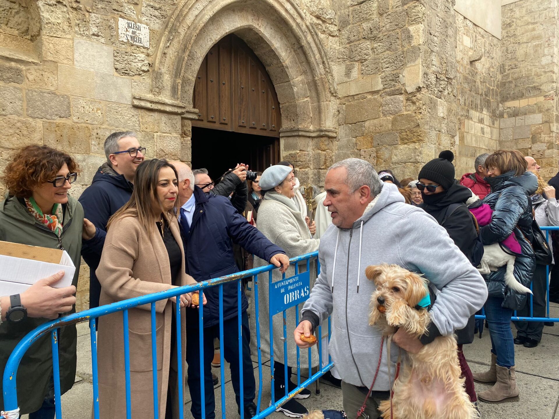 Las autoridades han repartido panecillo de San Antón a aquellos que han acudido a la iglesia de San Miguel para recibir la bendición a sus mascotas