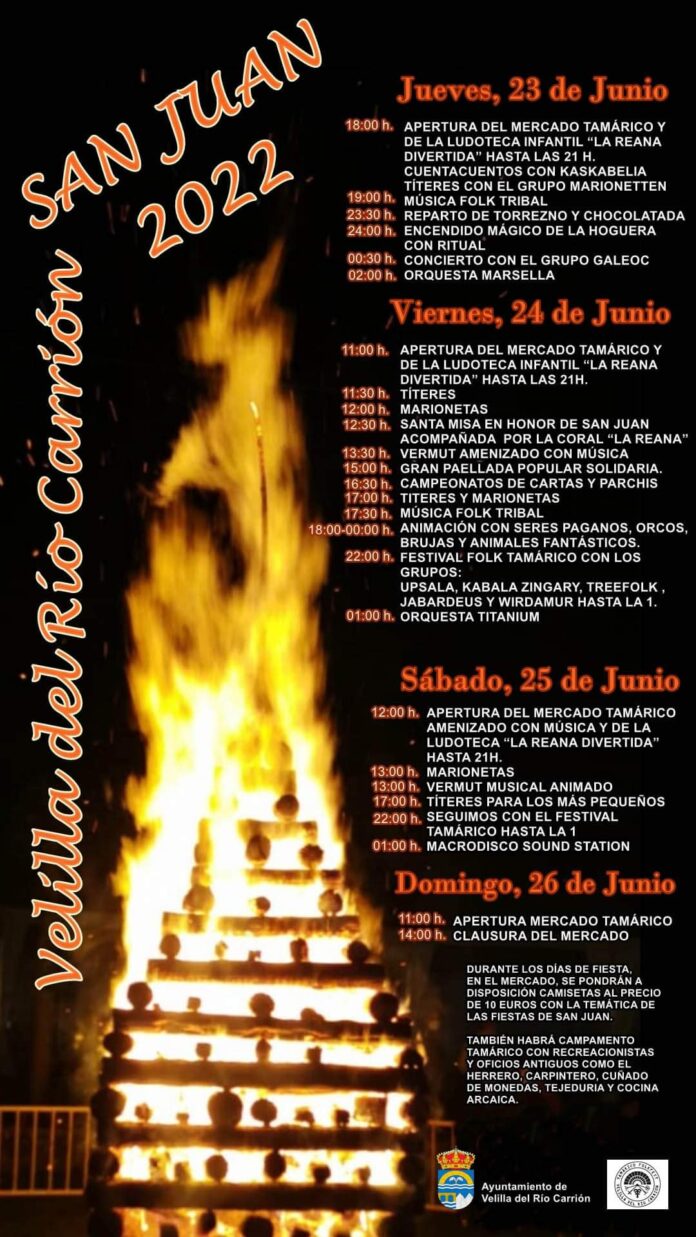 Velilla del Río Carrión celebrará, entre los días 23 y 26 de junio, las Fiestas de San Juan con un extenso programa que incluye actividades de todo tipo entre las que destaca el Mercado Tamárico en los entornos de La Reana y en el que participarán 40 expositores entre artesanos, tabernas y recreaciones de oficios antiguos como cocina arcaica, herrero, carpintero, tejeduría y cuñado de moneda. Un especial mercado que contará además con música y animación a cargo de seres paganos, orcos, brujas y animales fantásticos.