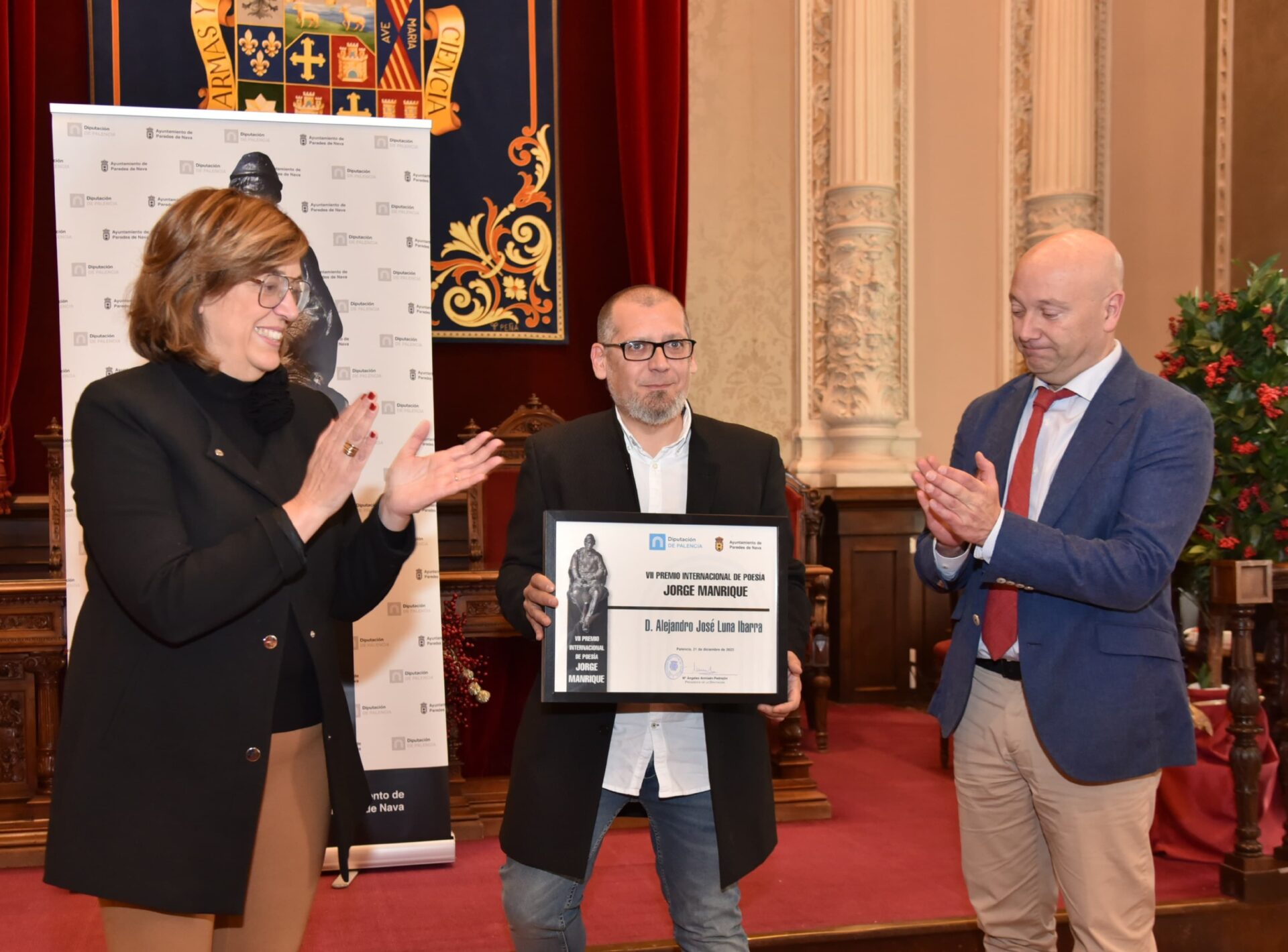 La presidenta de la Diputación de Palencia, Ángeles Armisén y el alcalde de Paredes de Nava, Luis Calderón, han hecho entrega del VII Premio Internacional de Poesía ‘Jorge Manrique’ que este año ha sido concedido al escritor Sandro Luna por la obra ‘La noche en que a Eddie Felson le rompieron los dedos’.