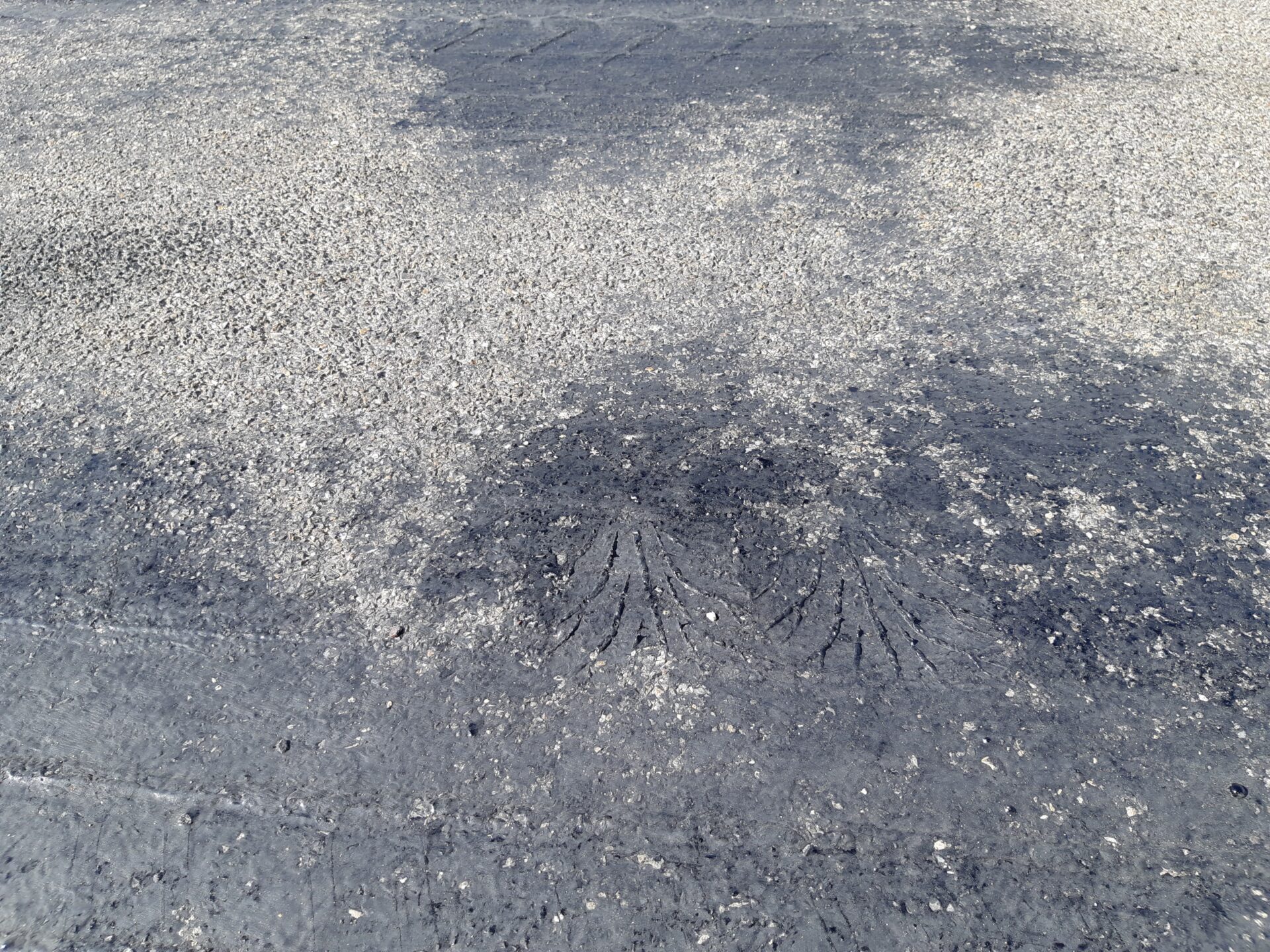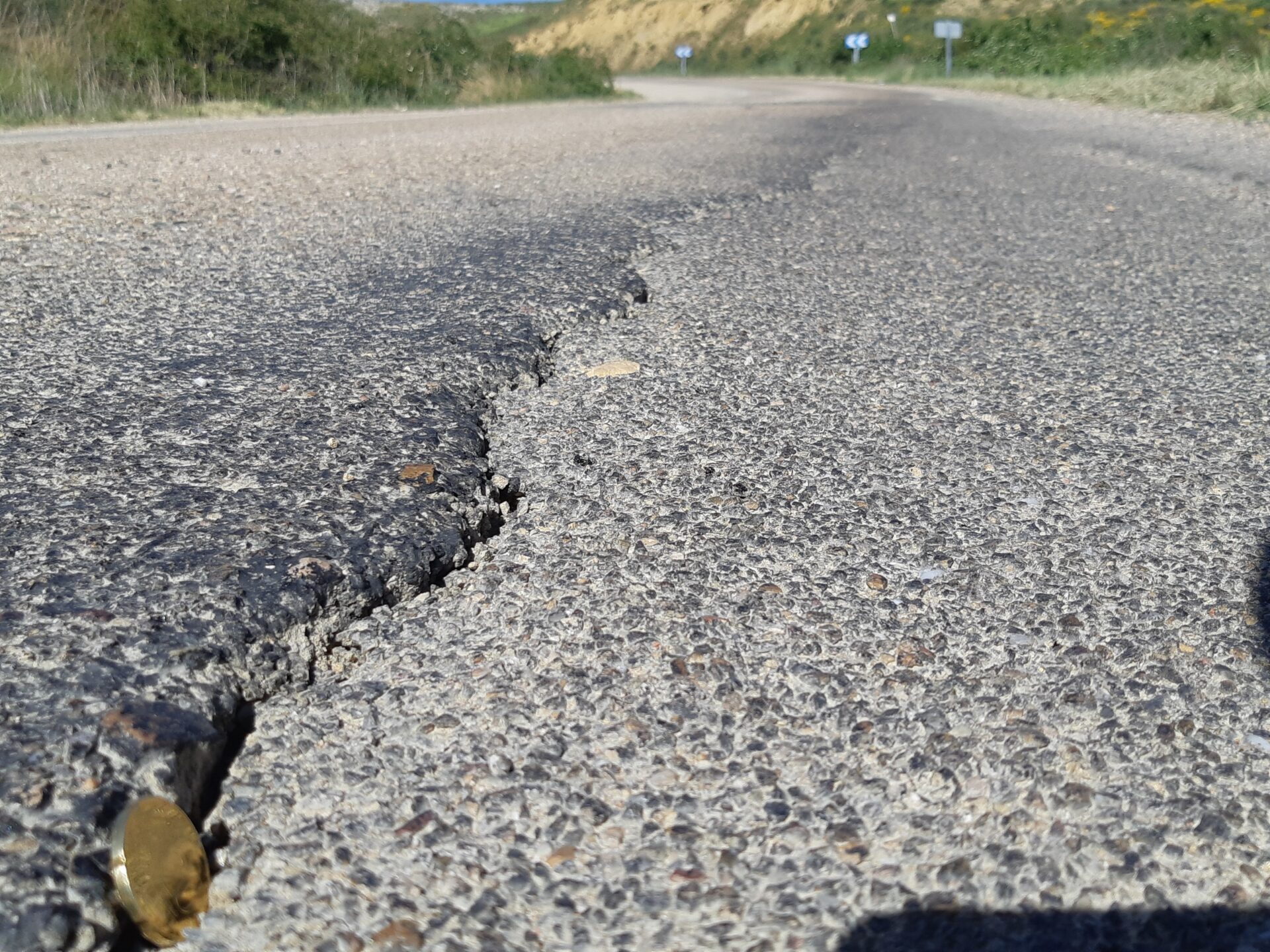 En la vía se pueden ver depósitos de gravilla y áridos en los laterales, grietas longitudinales, y transversales, blandones y resaltes.