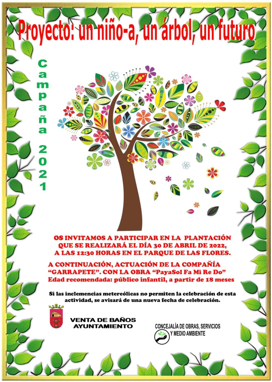 Por esto, desde el Ayuntamiento de Venta de Baños, a través de la Concejalía de Medioambiente, se invita a la cuarta plantación de árboles de la campaña 2021 del Proyecto: “Un niñ@, un árbol, un futuro”.