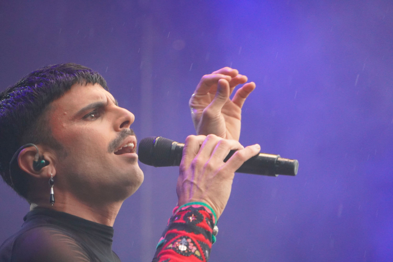 Pero había momentos también para ponerse serio. Como la canción Rambalín –que cantó vestido de rojo-, verdadera oda a la libertad sexual y crítica a quienes tratan de silenciarla hoy en día. Y, emocionado, recordaba al público que “somos unos privilegiados por estar aquí hoy, porque tenemos el privilegio de hacer muchas cosas bajo la lluvia”. Un privilegio del que no gozan muchas personas transexuales, homosexuales, mujeres asesinadas… “Ni los palestinos”. Y desde ese privilegio, añadía, “podemos hacer muchas cosas… Como ir a votar mañana, mecagondios”.
