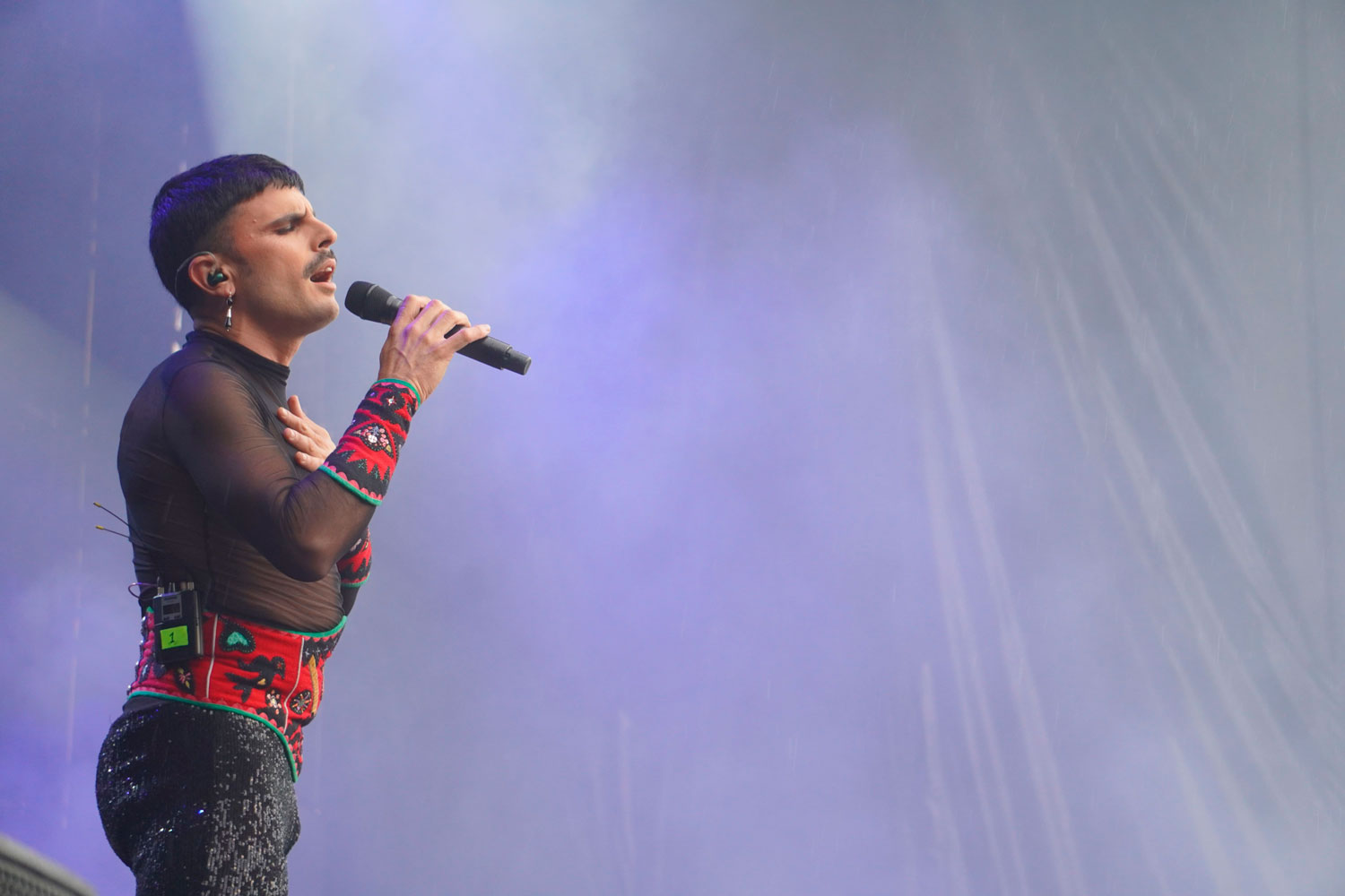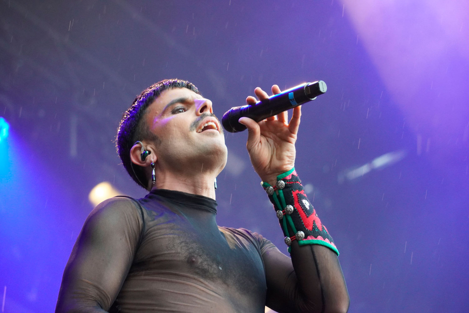 “¿Pero cómo se os ocurre hacer un festival en el paseo de las rogativas?”. Se preguntaba Rodrigo Cuevas al inicio de su concierto. “Llueve, mecagondios, ¡haced caso a la toponimia!” Pandereta en mano y derrochando desparpajo, la romería de este artista total comenzaba con lluvia, con chubasqueros de colores, paraguas y muchas sonrisas entre el público del Parque del Sotillo.