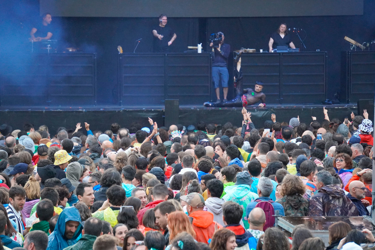 Y qué mejor manera de ejercer esa libertad, cuando no provocarla abiertamente, que un strepteasse. Porque para bailar, siempre es mejor estar cómodo, decía. E invitaba, mientras se retiraba las gafas y la chaqueta, a que el público se liberara de los chubasqueros y sintiera la lluvia sobre el cuerpo. “Así mantenéis la ropa seca y luego estáis más calentitos. Si viene lluvia fuerte nos desnudamos… ¡Qué rica el agua!”.