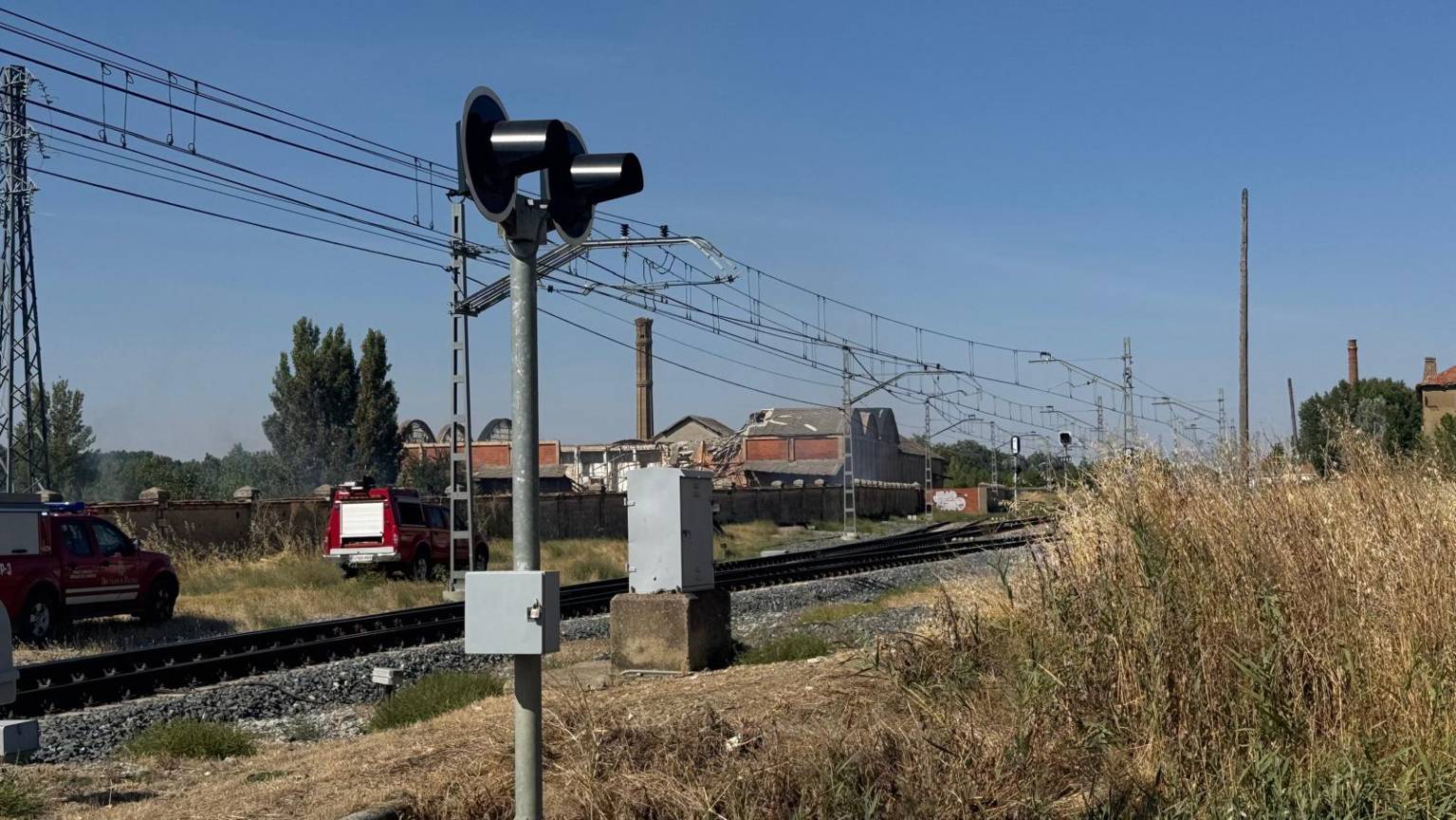 Las antiguas instalaciones de la azucarera de Monzón, llenas de maleza, fueron el lugar donde se propagó un fuego este viernes que puso en riesgo la circulación ferroviaria por este punto