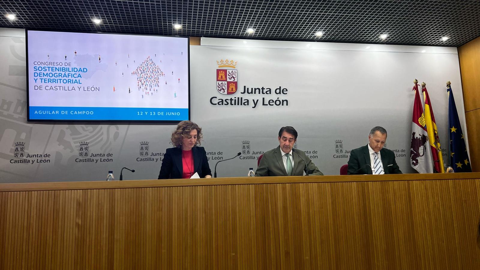 El consejero de Medio Ambiente, Vivienda y Ordenación del Territorio, Juan Carlos Suárez-Quiñones, acompañado de la directora general de Vivienda, Arquitectura, Ordenación del Territorio y Urbanismo, María Pardo, y el decano de la Facultad de Derecho de la Universidad de Burgos, Santiago Bello, ha presentado esta mañana el I Congreso de Sostenibilidad Demográfica y Territorial de Castilla y León, organizado por las universidades públicas de la Comunidad e impulsado por la Junta y que tendrá lugar en la localidad palentina de Aguilar de Campoo, los días 12 y 13 de junio.
