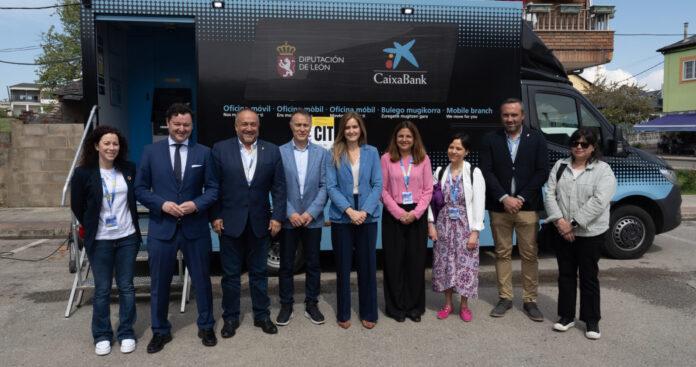 Sara Aagesen conoce de primera mano el funcionamiento de una de las ofimóvil de CaixaBank como la que recorre Palencia