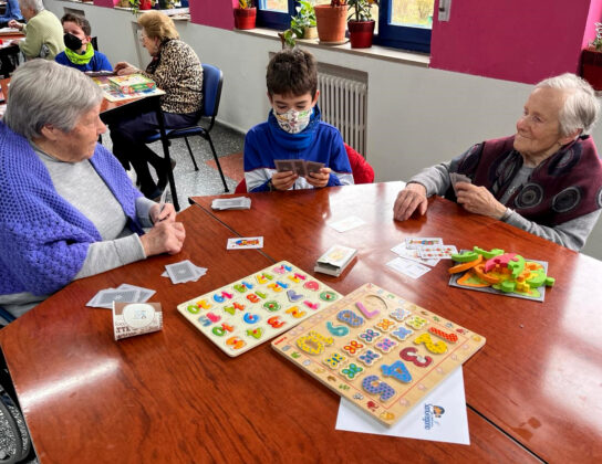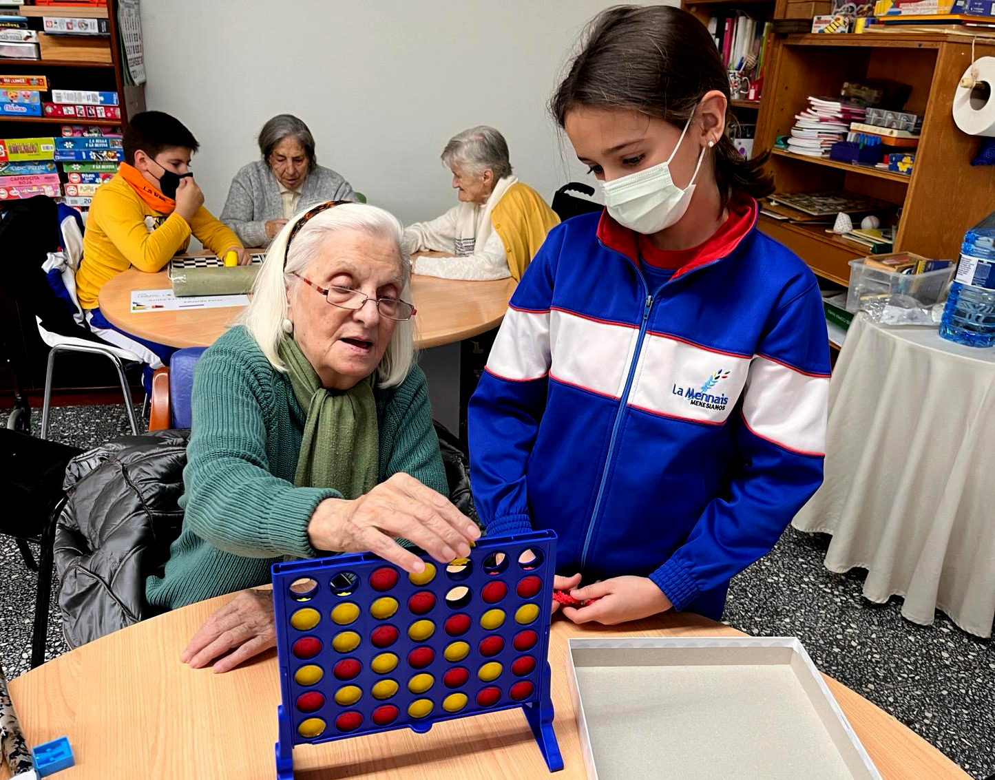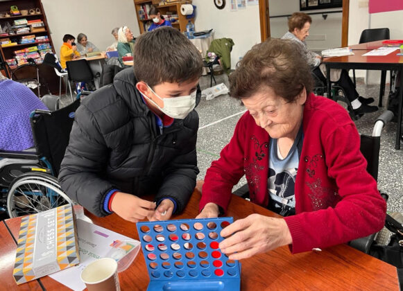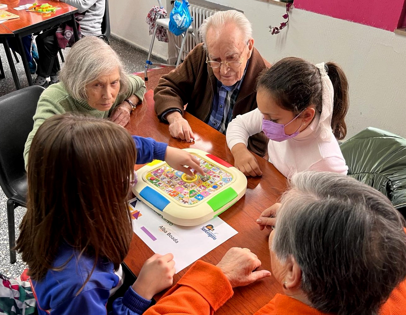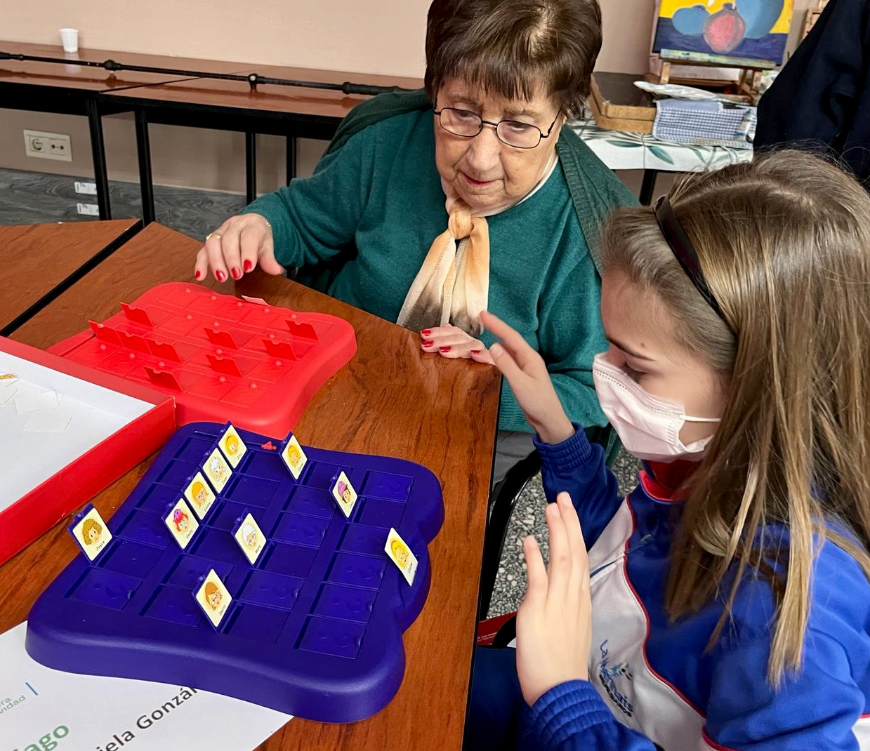 Como se aprecia en las imágenes, un grupo de alumnos de 4ª de Primaria del Colegio San Gregorio compartieron una sesión de juegos con los residentes. Un momento de aprendizaje y diversión para ambas partes, que pudieron intercambiar secretos o claves de éxito en juegos de mesa tradicionales como el tute, el parchís, la oca, el dominó o el cuatro en raya.
