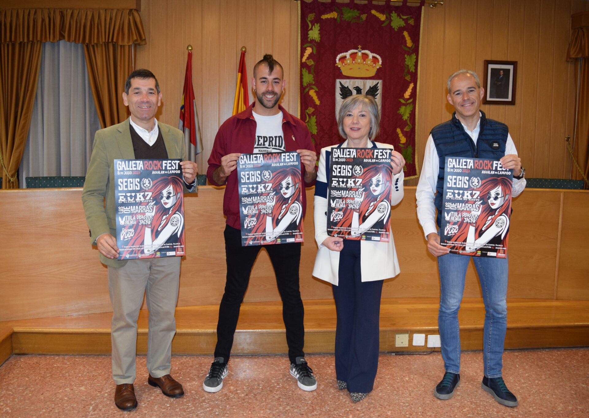 La alcaldesa de Aguilar de Campoo, María José Ortega; el concejal de Festejos, Diego Pérez; Francisco Hevia, director corporativo de Galletas Gullón, y David Calderón, miembro de la Asociación Cultural Galleta Rock, han presentado hoy el cartel final del Galleta Rock Fest, que se celebrará el día 8 de julio el la Ciudad Deportiva Alberto Fernández de Aguilar de Campoo.