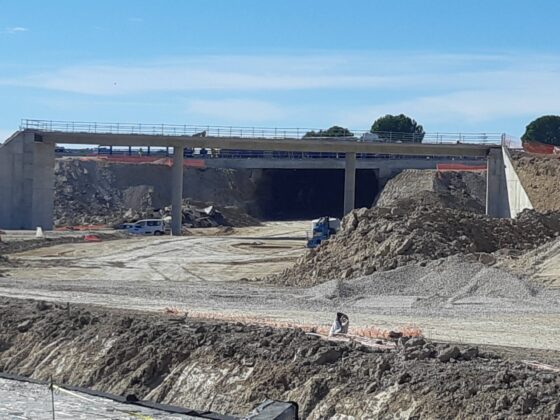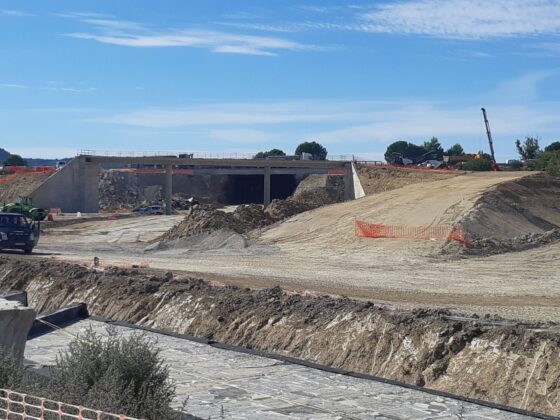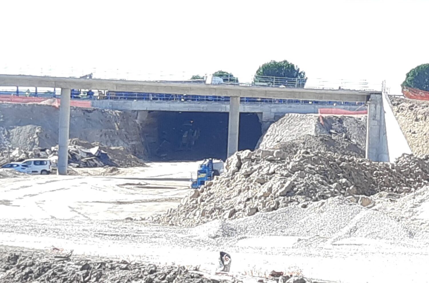 Pero el objeto concreto de ese desvío en la autovía es la construcción de una oquedad bajo la autovía por la que circulen en su día los trenes de Alta Velocidad. Y acercándose un poco a la obra, se puede comprobar cómo lo que se ha creado bajo la calzada ascendente de la A-67 es una mina. Se está ‘minando’ la autovía.