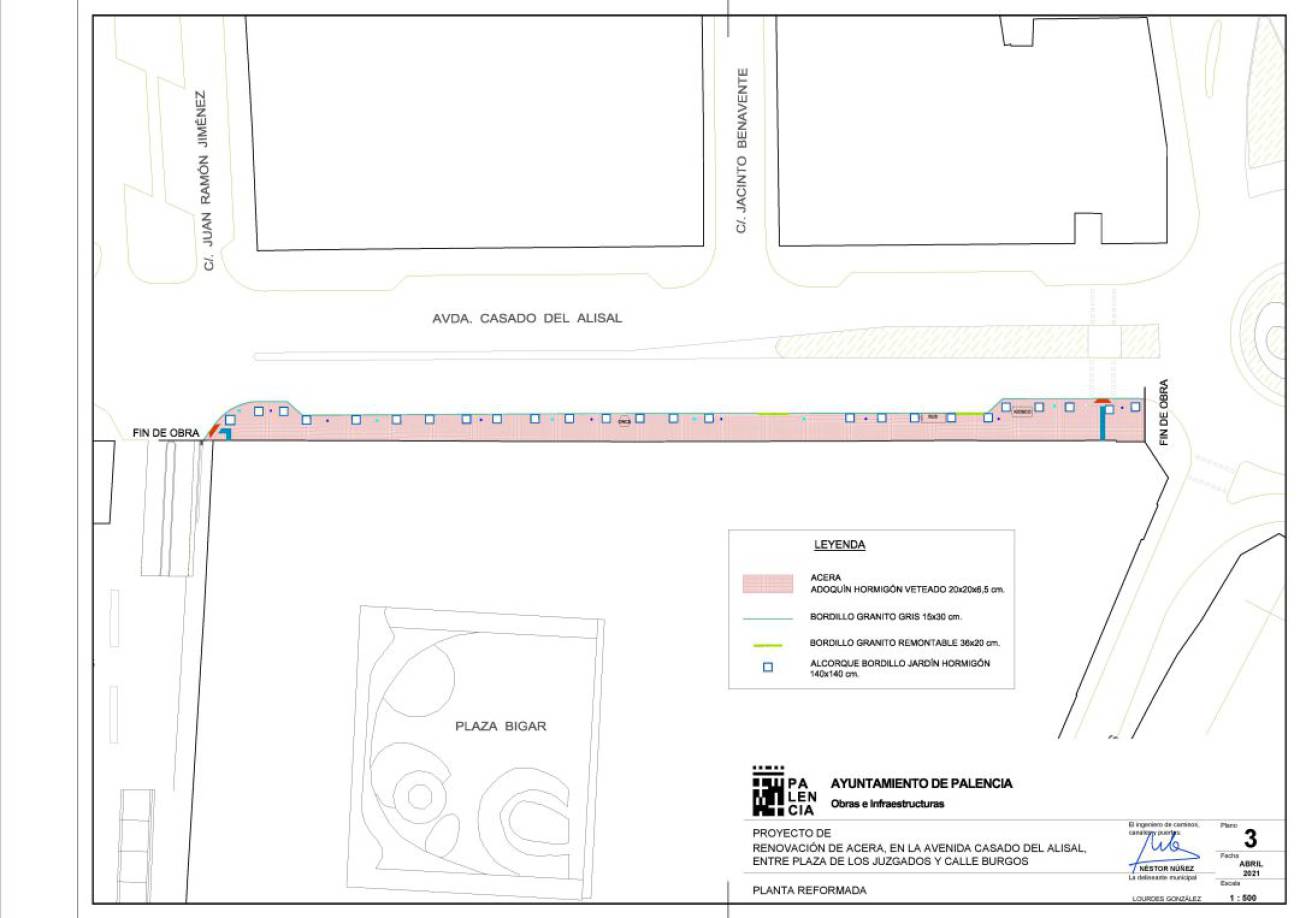 El servicio municipal de Obras de Palencia prevé renovar de forma integral el acerado del tramo comprendido entre la calle Burgos y la plaza de Los Juzgados de la avenida Casado del Alisal por un montante global de 87.717 euros.