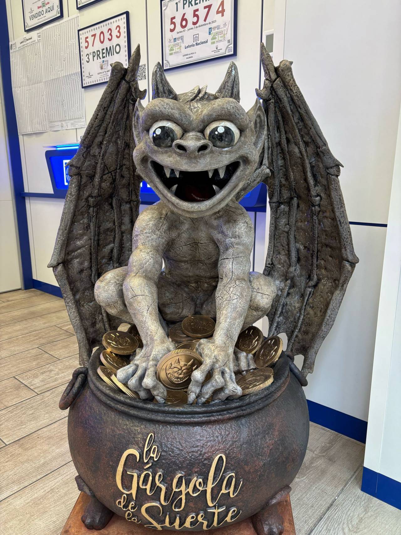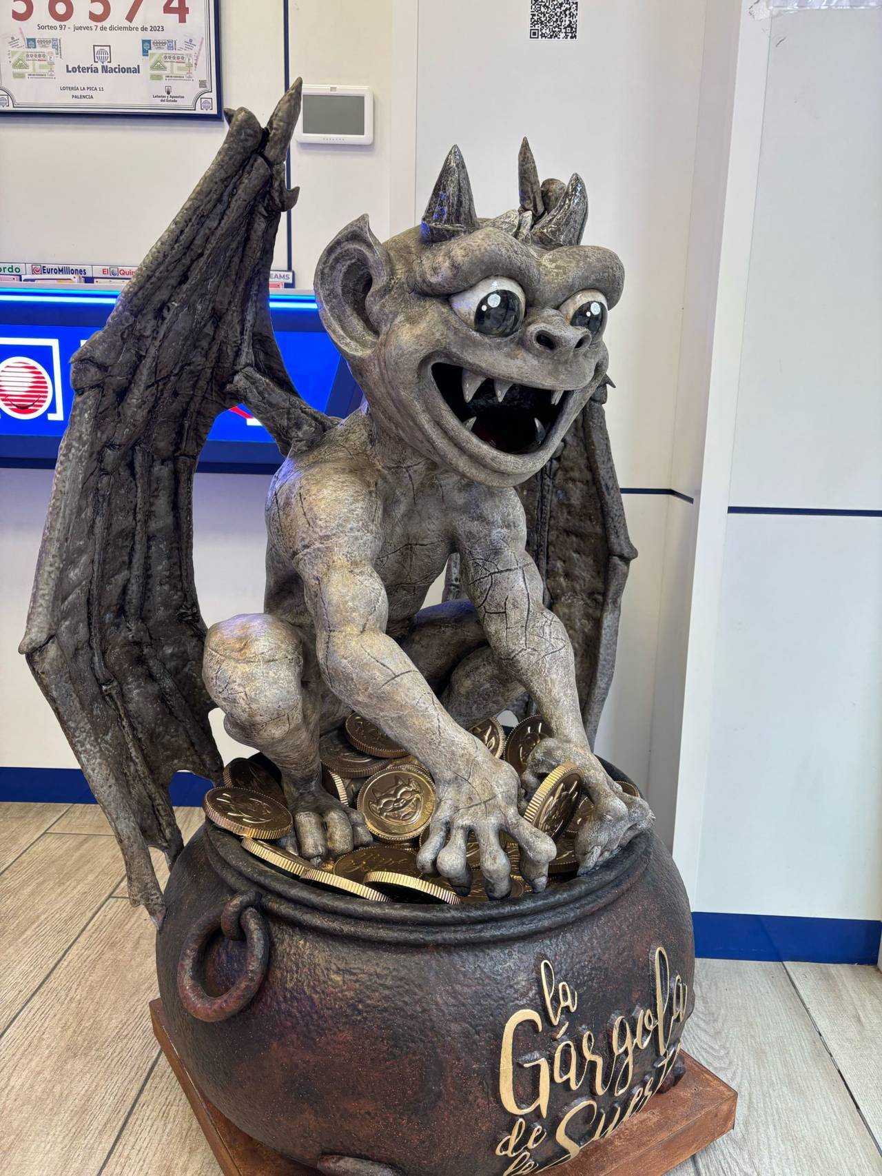 La administración de lotería número 11, ubicada en la calle Barrio y Mier del centro de la capital palentina, ha consagrado su “advocación” a la gárgola de la suerte de la catedral de Palencia, después de la “profecía” que un cliente habitual expresó a su propietario, Christian Carrasco. Hoy, casi dos años después de la apertura en esta nueva ubicación, el local recibía la llegada de la esperada mascota, una escultura realizada por el artista palentino Óscar Aragón. Y curiosamente, la profecía volvía a cumplirse, porque precisamente hoy ha entregado un premio de 32.000 euros.