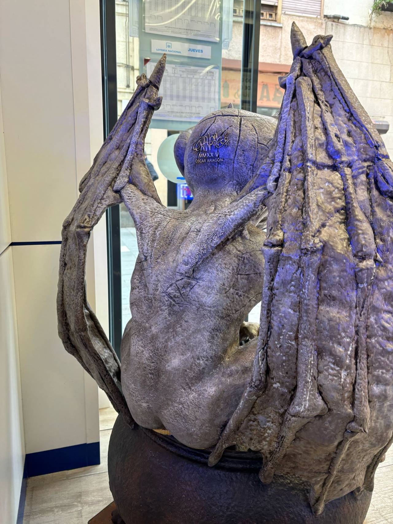 Y sonríe, mostrando sus colmillos con expresión divertida, tal vez porque presume de haber entregado, desde aquella particular premonición, en 2023 dieron el segundo premio de Euromillones, el primero de la Primitiva, o el primero de la Lotería Nacional. Inauguraban 2024 con el tercero del Sorteo del Niño y continuaban el año con dos permios de 14 aciertos en La Quiniela, un primero de la bonoloto y, ahora, esta primitiva, que parece “bendecir” la nueva estatua creada por Óscar Aragón.