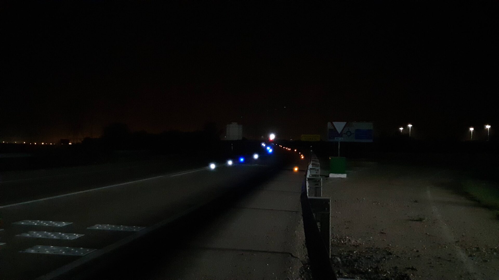 La hilera de la derecha es de color naranja (como los hitos que se colocan en los guardavías o en los laterales de las carreteras) mientras que los de la izquierda intercalan leds blancos con azules, para que sean más llamativos. Todos ellos encastrados en el asfalto.