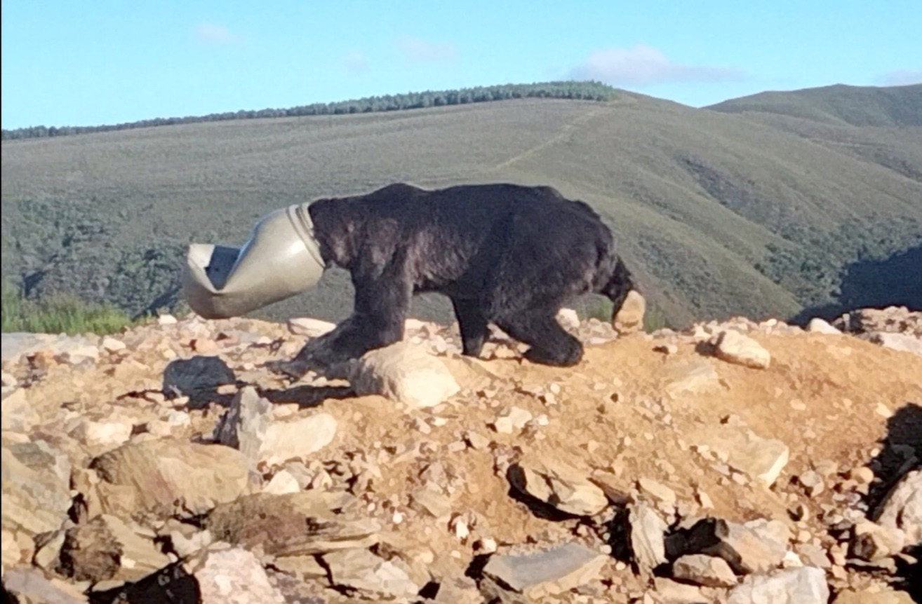 Veterinarios clínicos de la red de centros de fauna de la Junta de Castilla y León liberan a un oso pardo con la cabeza atrapada en un bidón de plástico en la localidad leonesa de Anllares del Sil, en el municipio de Páramo del Sil (León)