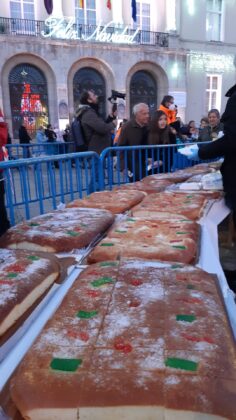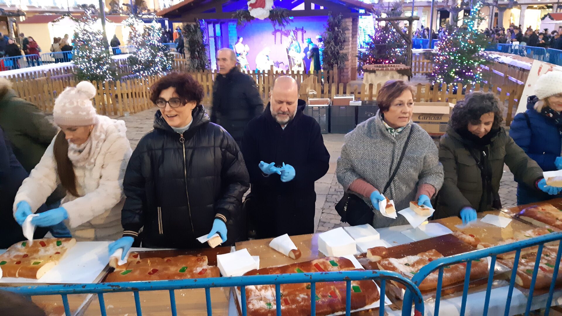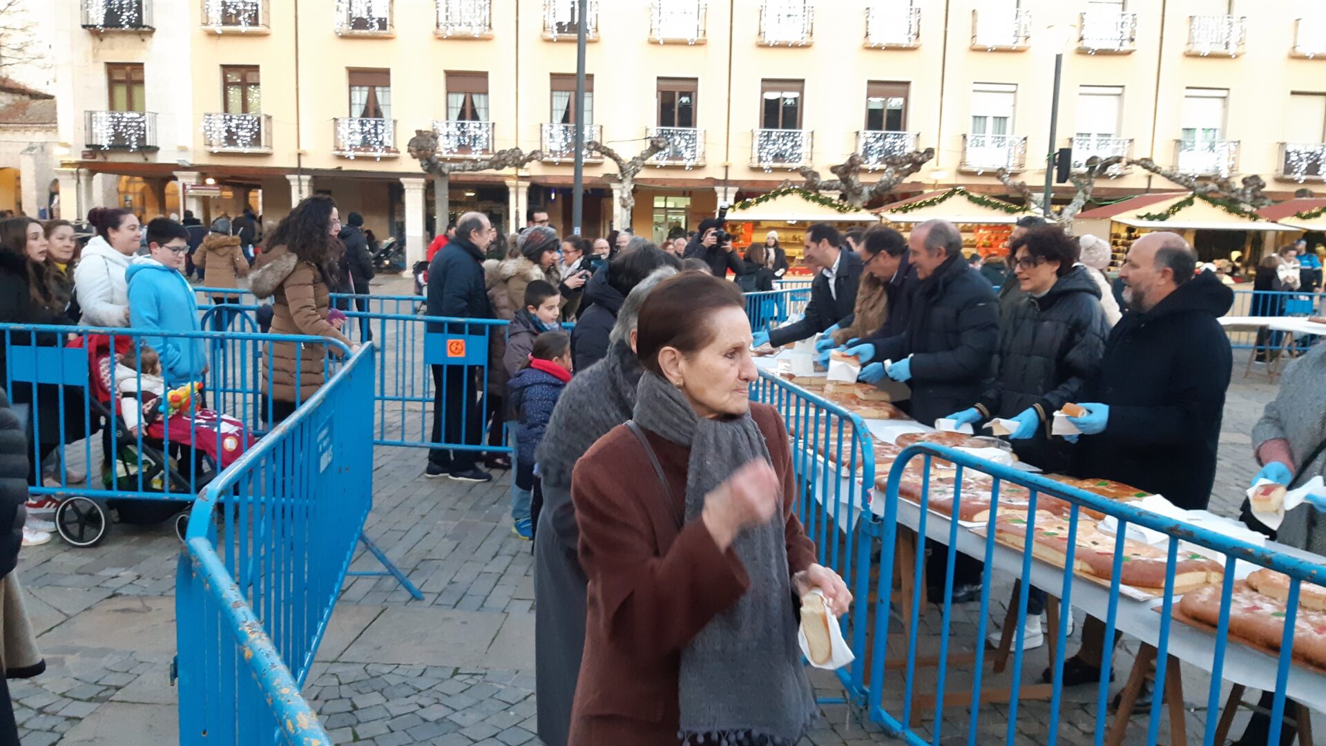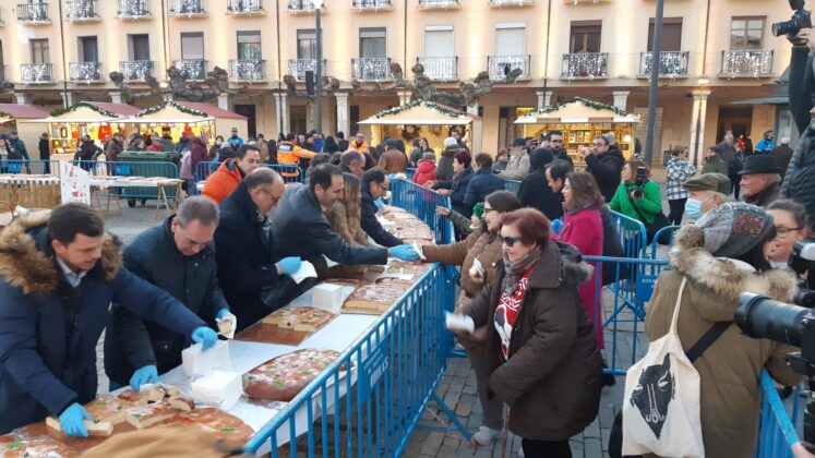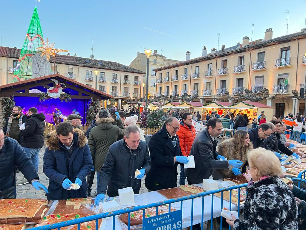 A un ritmo de 100 raciones por minuto y unos 75 minutos después que el alcalde de Palencia, Mario Simón, flanqueado por el concejal de Hacienda, Luis Miguel Cárcel, y la de Cultura, Turismo y Fiestas, Laura Lombraña, arrancara la entrega, el dulce recordatorio de que estamos en Navidad se acabó.