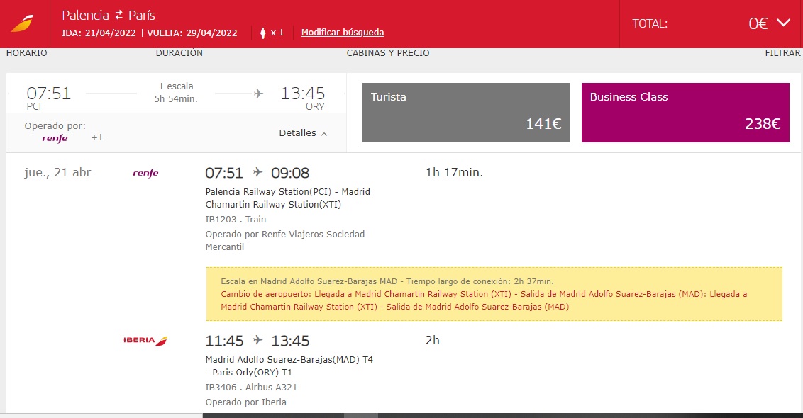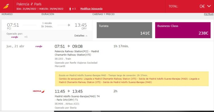 Imagen de la web de Iberia, donde se puede comprar un único billete combinado tren-avión entre Palencia y París