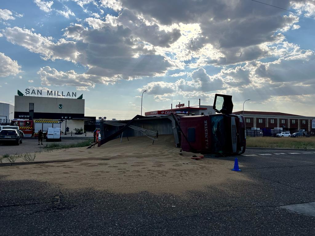 Un conductor volcaba un camión en la Avenida Comunidad Europea, a la altura de la rotonda cercana al cementerio, sobre las 19:00 horas de la tarde del día de ayer, con toda la carga de trigo esparcida por esta zona del polígono industrial de la capital.
