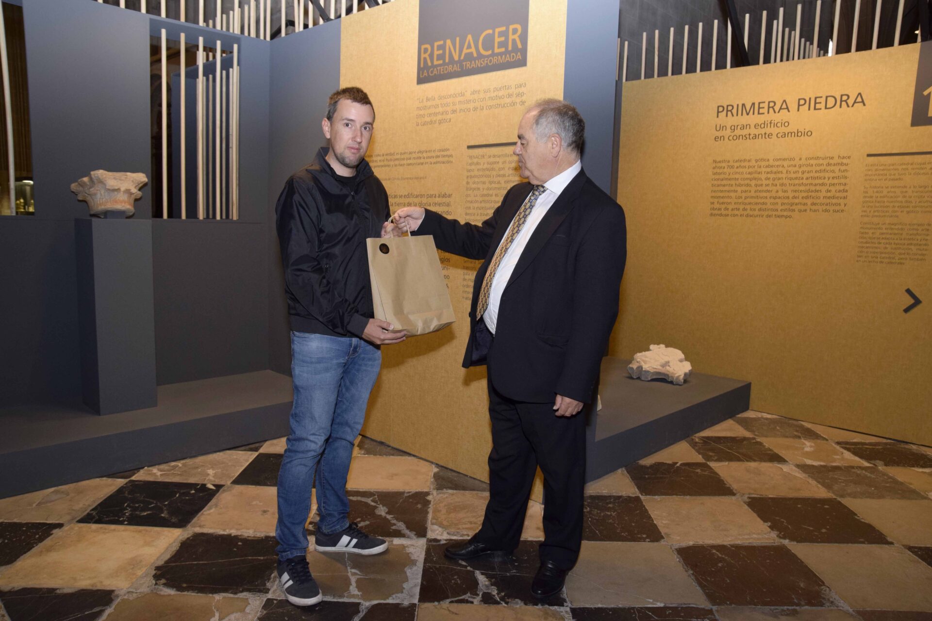 Roberto García, un ciudadano palentino, es el visitante 30.000 de la muestra «Renacer» de la Catedral de Palencia, que recibe un obsequio de manos del comisario de la muestra y canónigo fabriquero de la Catedral, José Luis Calvo.